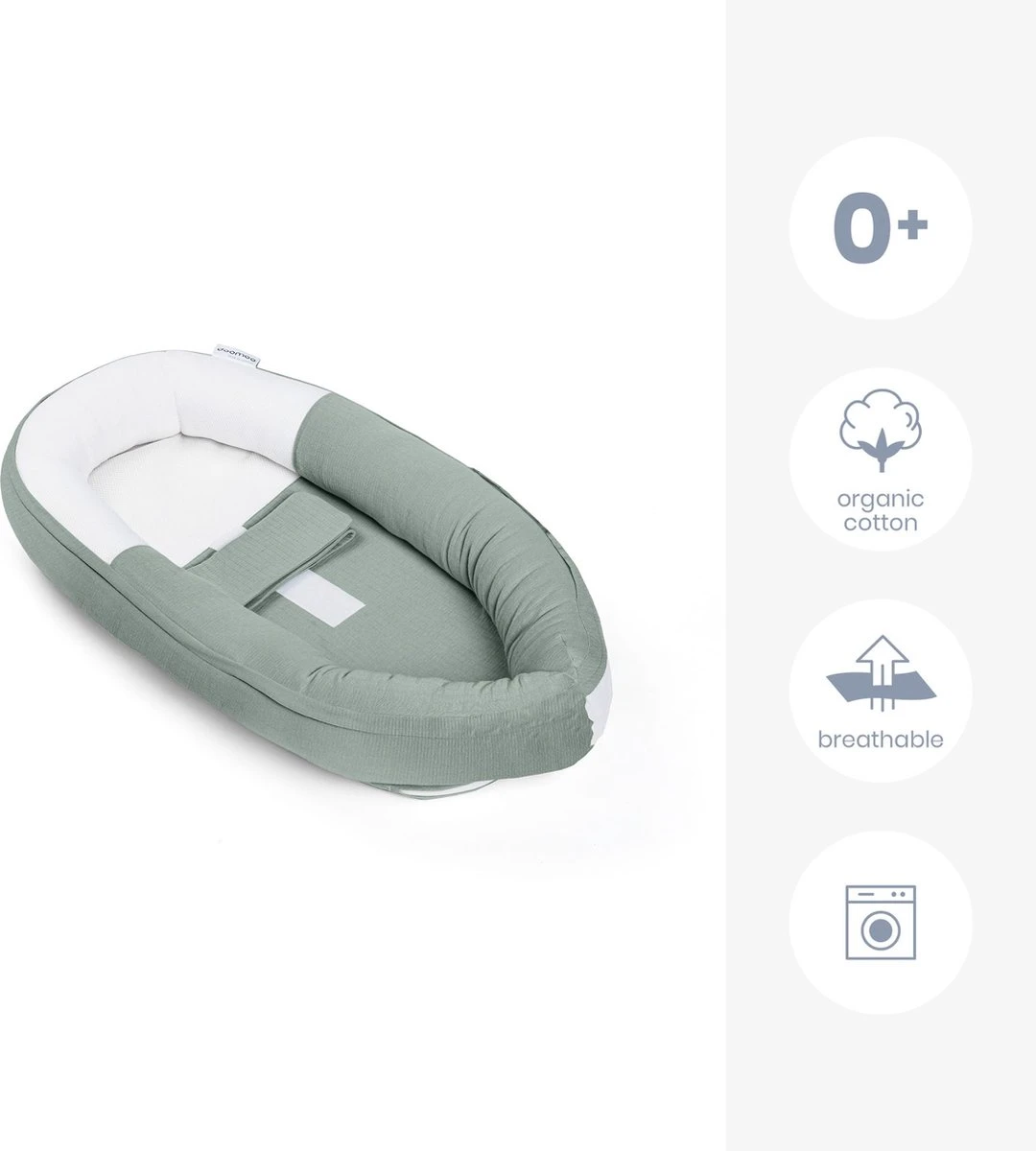 Het nestje is gemaakt van de zachtste materialen: biologische katoen en ademend 3D materiaal rond baby’s hoofdje.