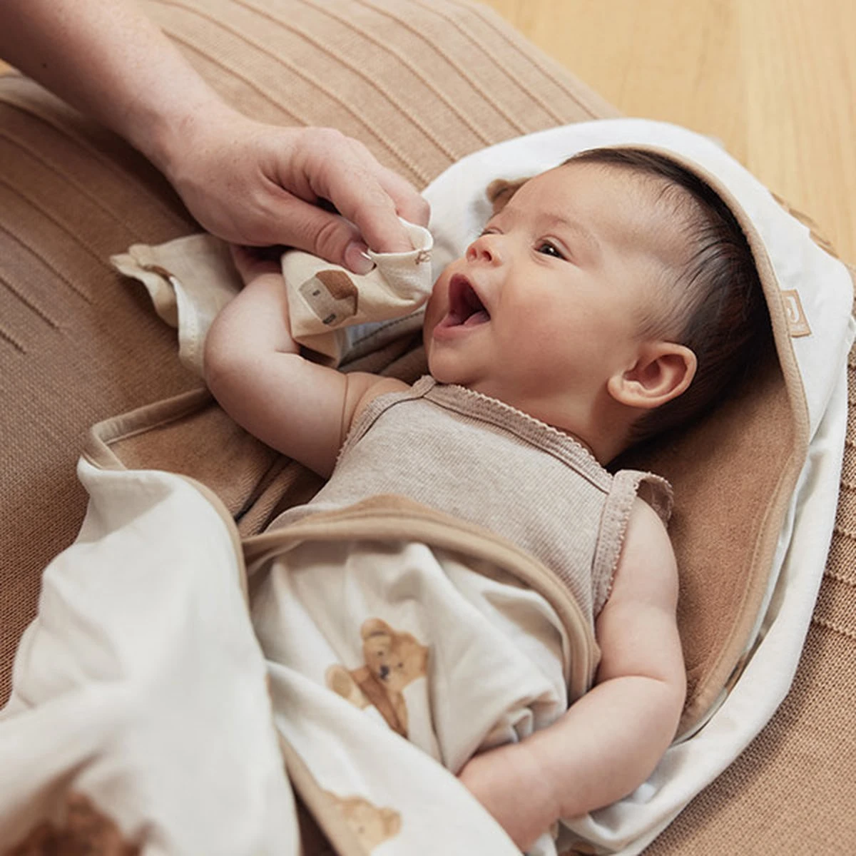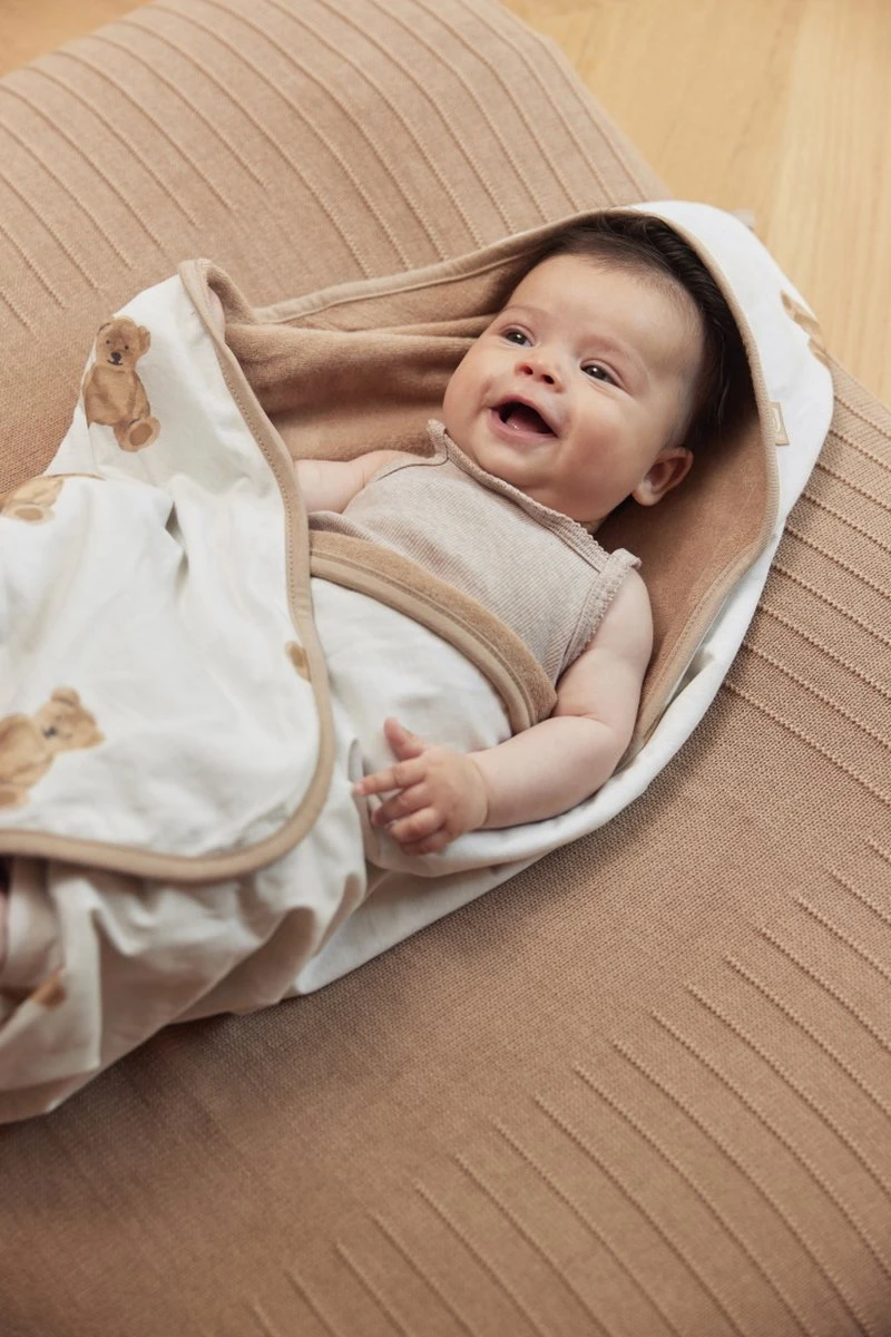 De Ivory ondegrond matcht goed met de Chestnut en Biscuit kleurige beertjes. Je combineert dezeDit product kun je strijken maar beter dat je het niet doet. Ongestreken neemt stof meer en beter vocht op. Wel zo makkelijk tijdens het afdrogen.