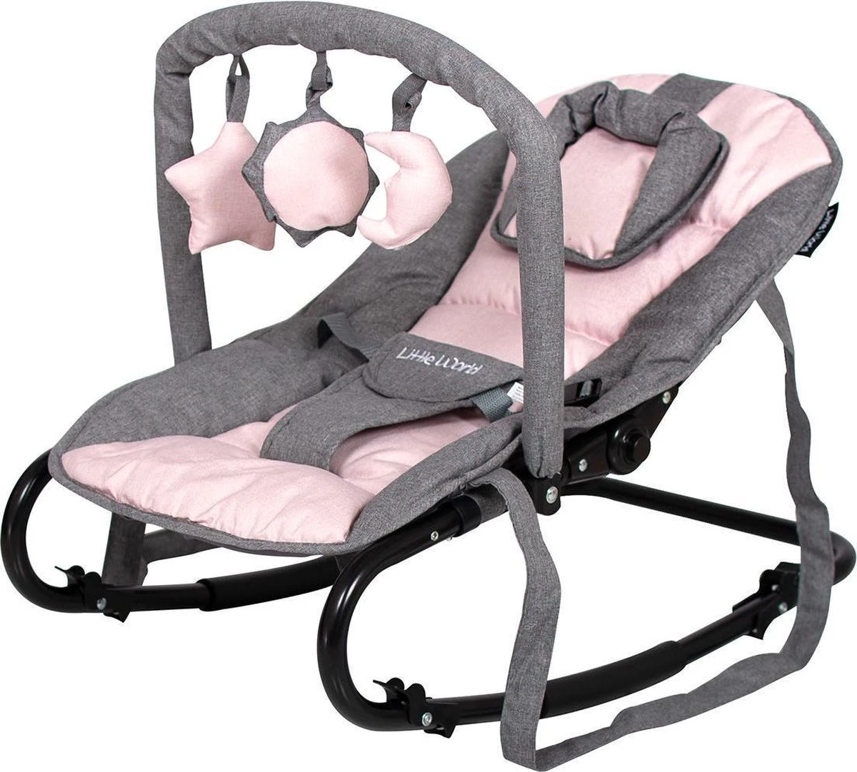 In deze Baby relax Wipstoel van Little World zal je kleine zich uren kunnen vermaken. De wipstoel is uitgevoerd in een mooie melange bekleding. De wipstoel wordt compleet geleverd met speelboog en hoofdkussentje.
