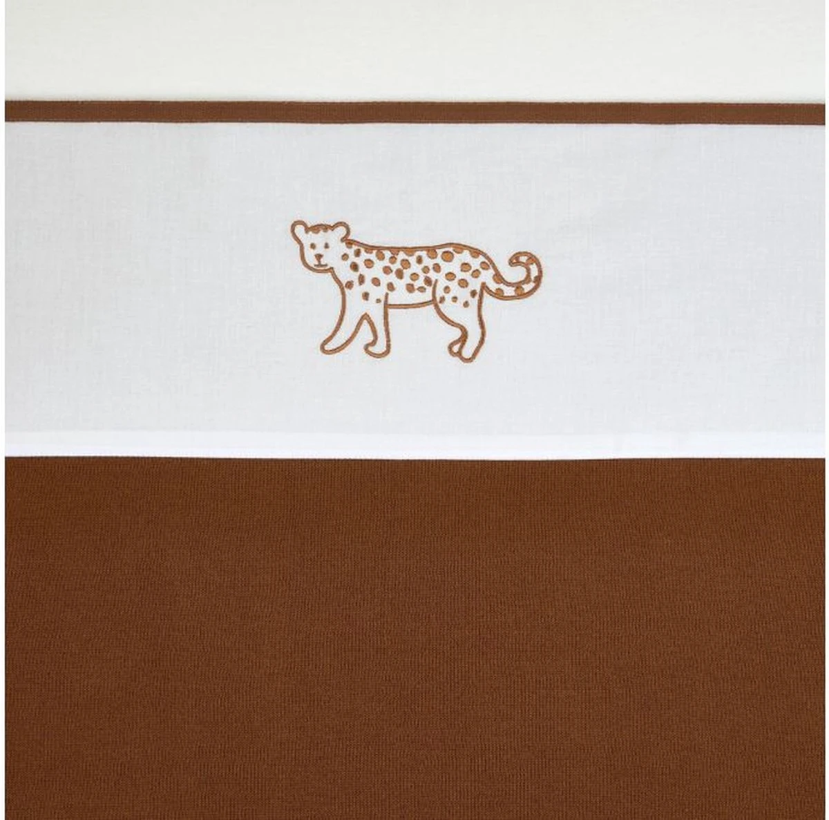 Een heerlijk zacht lakentje van 100% katoen. Door het gebruik van 100% katoen is het lakentje goed ademend en veilig, maar vooral comfortabel om onder te slapen. Het witte laken is voorzien van een gekleurde bies en geborduurde cheetah.