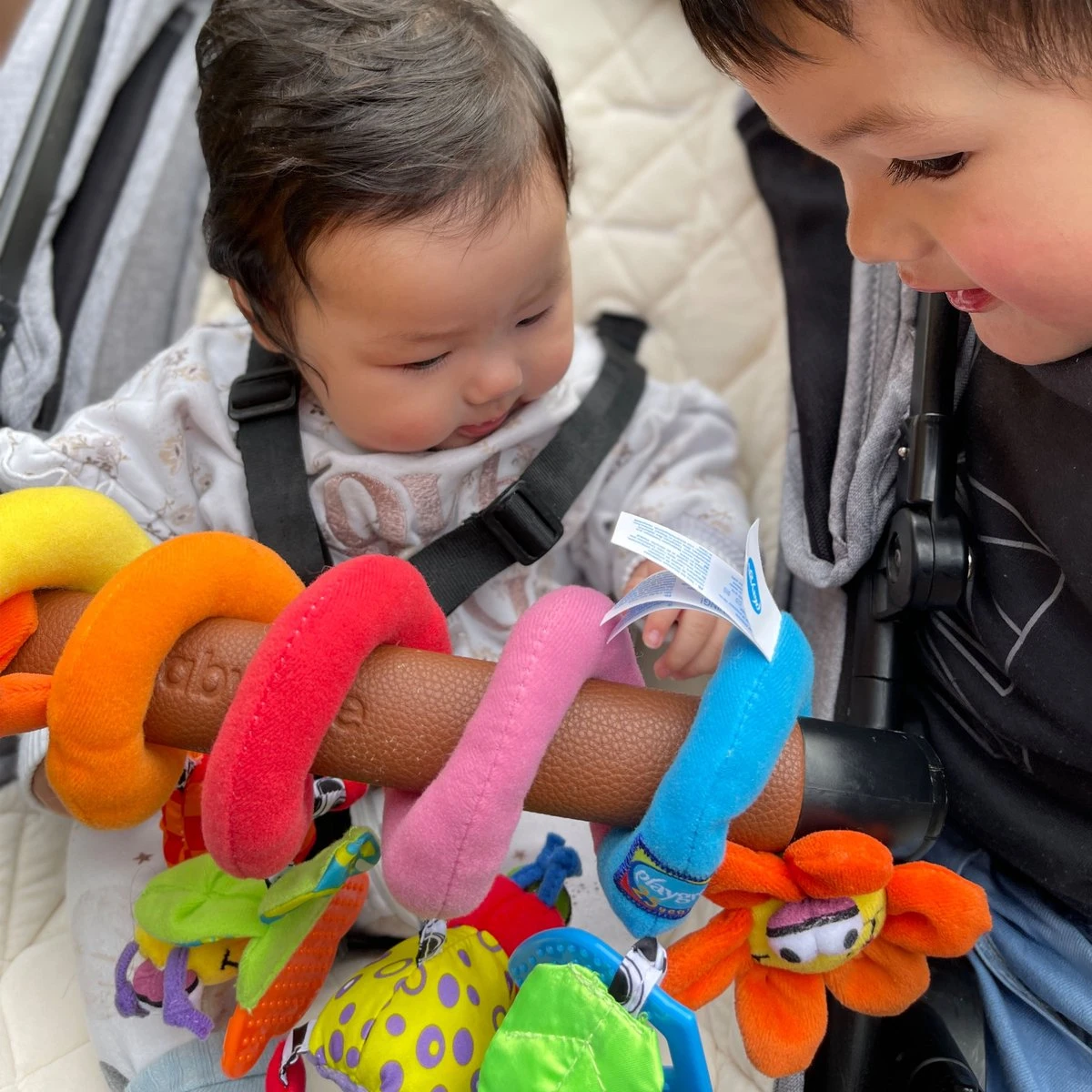 Deze kleurrijke boxspiraal Tuindieren bestaande uit verschillende materialen, kleuren en hangspeeltjes zal je kindje onderweg goed vermaken.