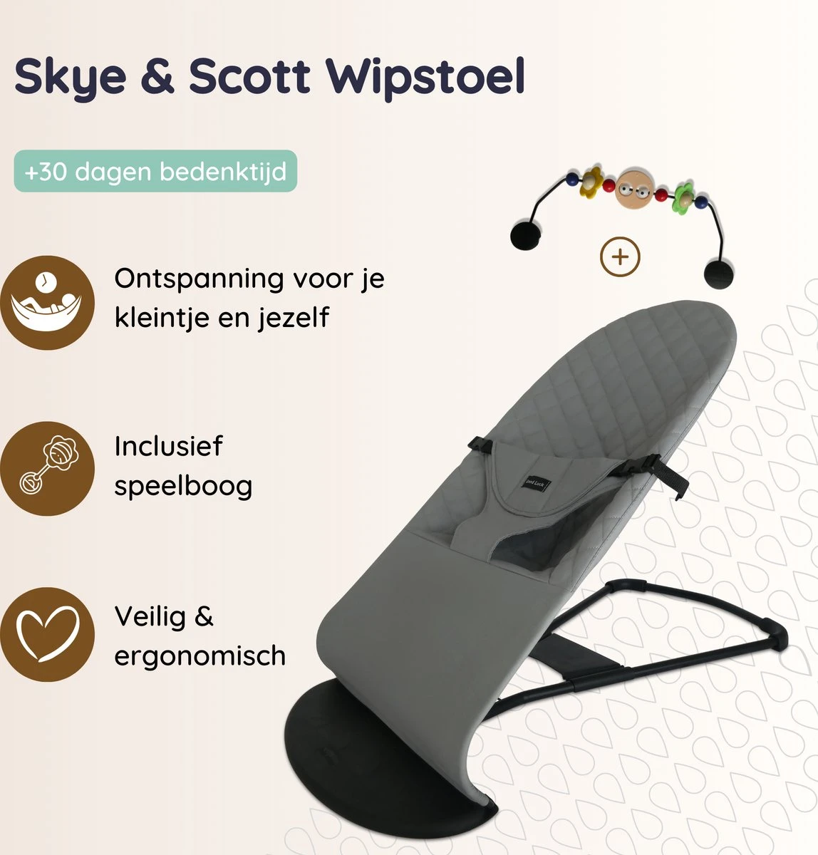 Geef je baby en jezelf een heerlijk relax-momentje met de ergonomische wipstoel van Skye & Scott. De baby bouncer met bijgeleverde speelboog zorgt ervoor dat je baby lekker kan ontspannen in een comfortabele schommelstoel.