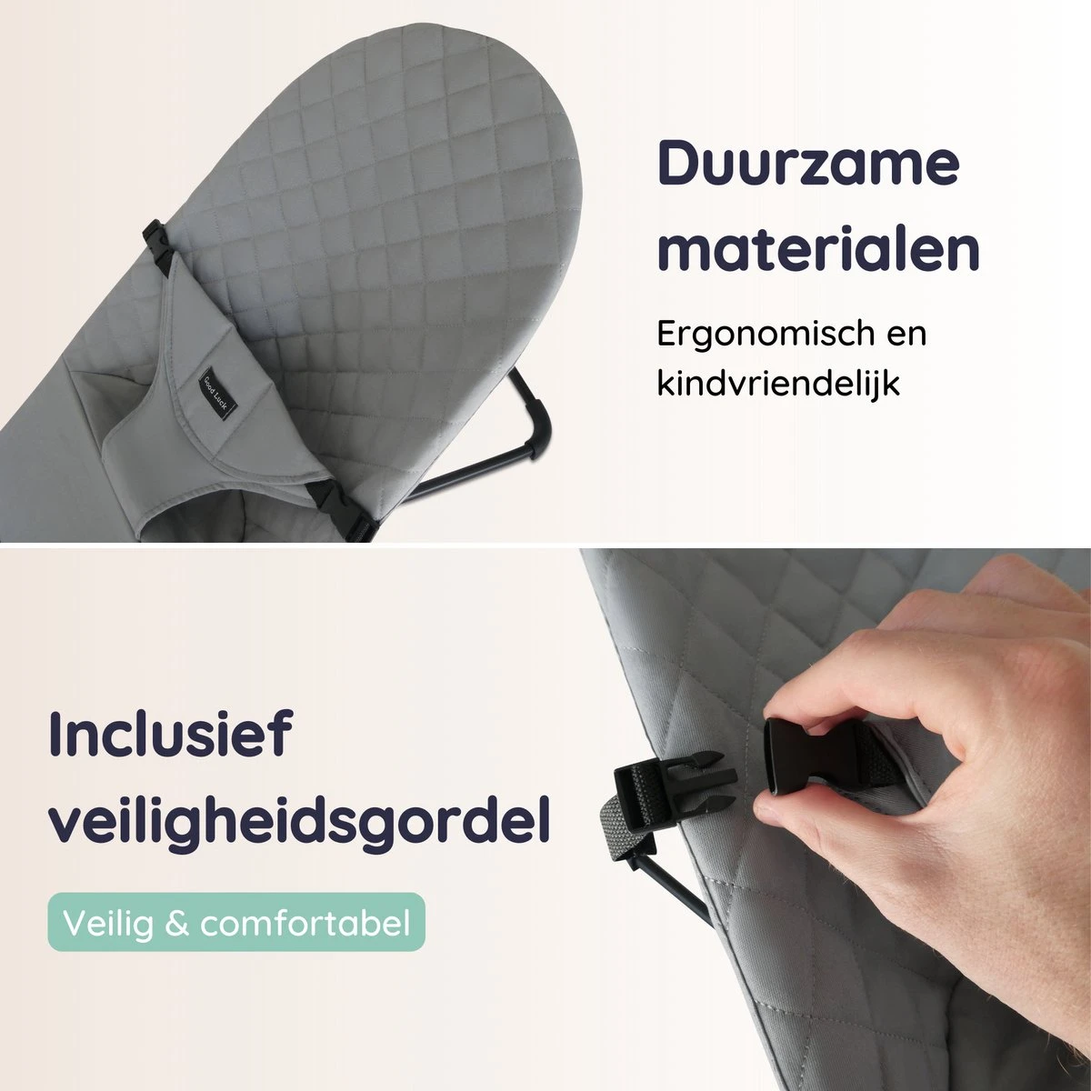 Gemaakt van hoogwaardig en veilige (non-toxic) materialen. Hiermee voldoet de wipstoel aan de Europese kwaliteitsnormen en kan je zorgeloos je kleintje laten ontspannen.
