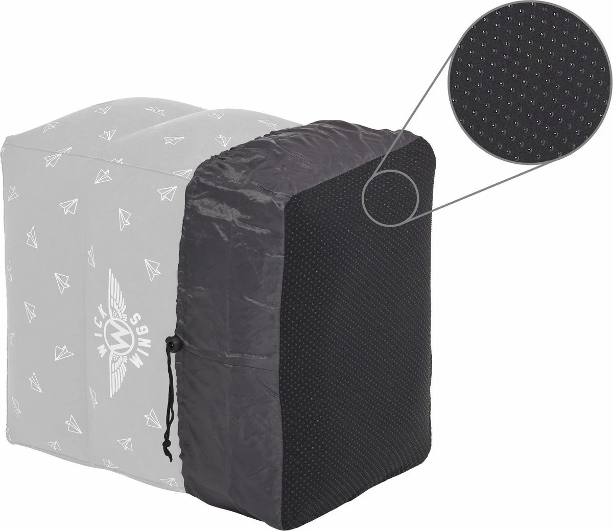 Wick Wings staat bekend om haar hoge kwaliteitsproducten waarbij veilig en gezond vervoer in het vliegtuig centraal staat. Wick Wings heeft een elastische overtrek met anti-sliplaag ontwikkeld zodat het vliegtuigbedje echt goed vast staat op de ondergrond in het vliegtuig maar ook in de trein, bus of auto. De overtrek is geschikt voor alle opblaasbare vliegtuigbedjes. U kunt het elastiek aansnoeren door aan het touwtje te trekken. Deze kunt u vastzetten door op de zwarte knop te drukken.